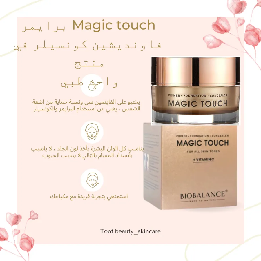 يعمل برايمر وكريم أساس وخافي عيوب Magic Touch 3 في 1 على توحيد لون البشرة على الفور، وتغطية الاحمرار والبقع الداكنة والهالات السوداء والخطوط الدقيقة وعيوب البشرة.